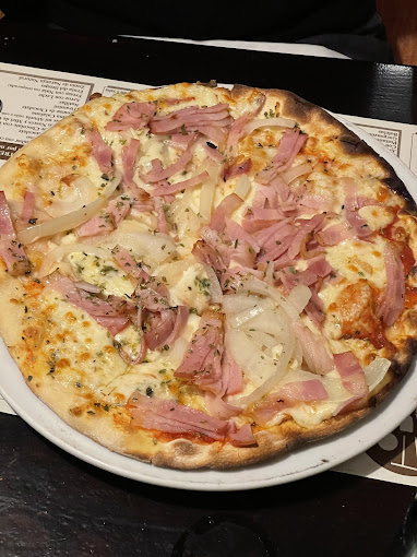Piña, jamón York, champiñón, tomate, orégano y Mozzarella